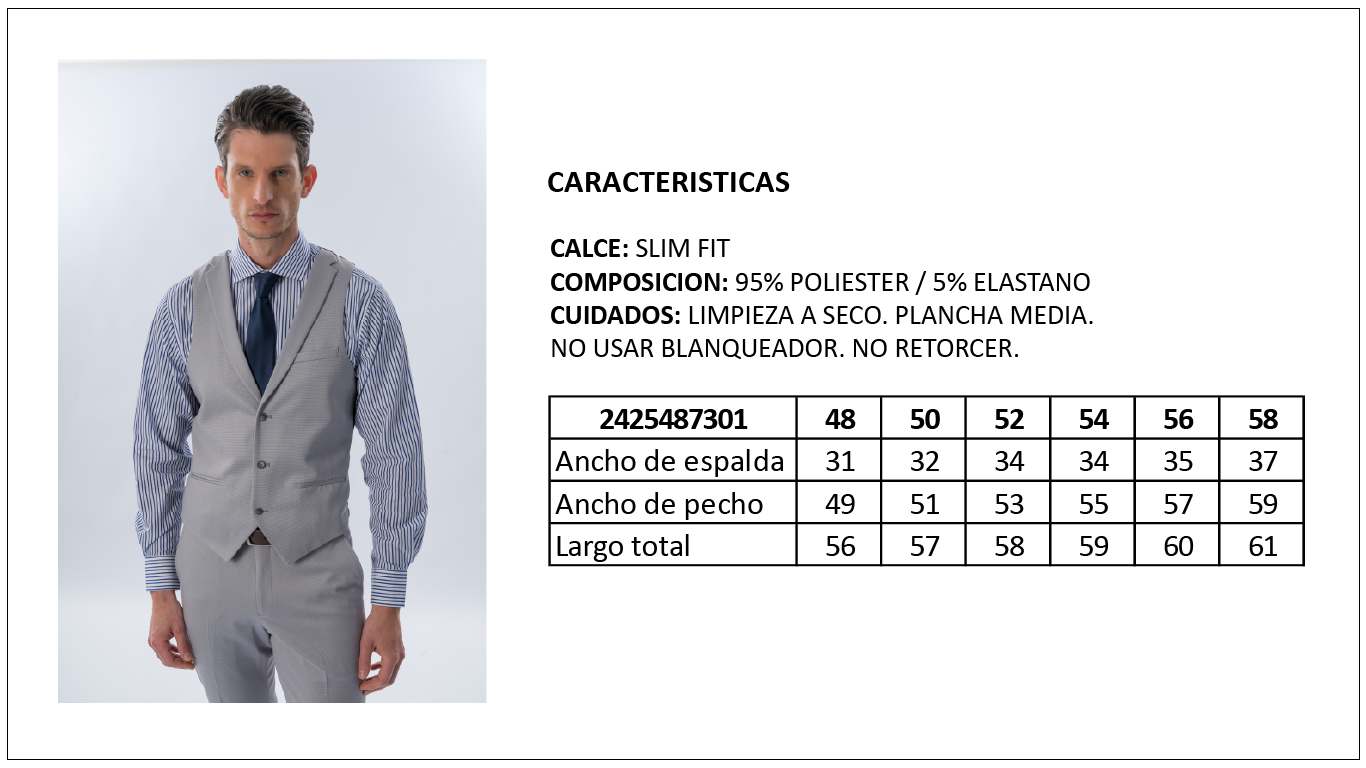 Chaleco vestir, recto, tela fantasía, con solapa, 3 botones y bolsillo ojal. TECNOLOGIA COMFORT FORMAL. La composición del tejido incluye un 5% de spandex. Características: