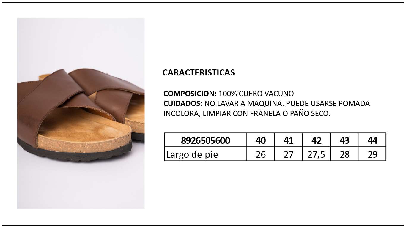 Sandalia de cuero vacuno, doble tira. Plantilla super flex, forrada con descarne cuero vacuno, lo que permite que el pie no transpire, y mezclada con corcho natural con goma, lo que la hace super flexible y cómoda al andar. Ideal para vestir con estilo en climas calurosos y completar tus outfits veraniegos.